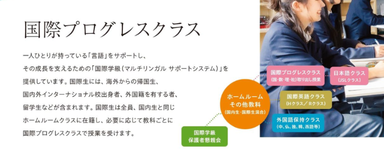 また、オールイングリッシュで学ぶ「国際英語クラス」のほか、英語以外で学習をしてきた生徒用の「外国語保持クラス」を5つの言語(中国語・韓国語・ドイツ語・フランス語・スペイン語)で設け、海外で身につけた言語を維持伸長させます。
