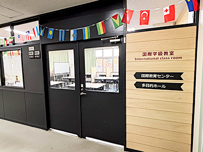 「国際学級教室」では、国語と数学の取り出し授業を行っています。生徒はみな個別の時間割で動いているため、同じ時間に複数の学年が同じ教室で学ぶ状況が生まれますが、本校では日常的なスタイルです。